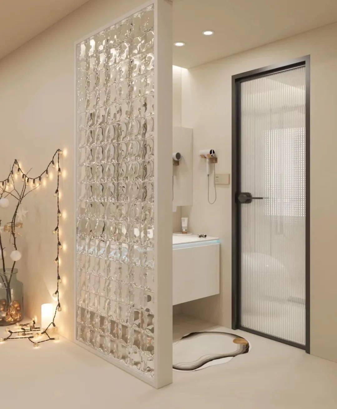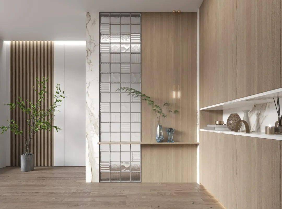 大都家庭会正在玄关处设想一个隔绝距离。分歧灯光下的玻璃砖呈现的颜色也分歧。